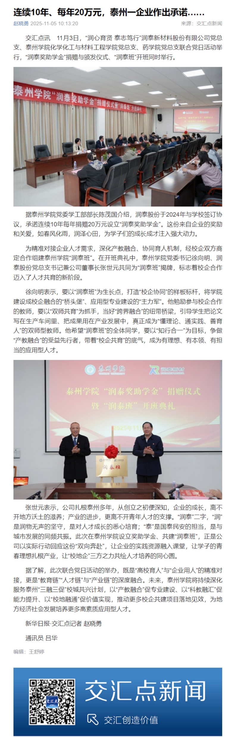 《交汇点新闻》2025年11月5日报道《连续10年、每年20万元,泰州一企业作出承诺……》