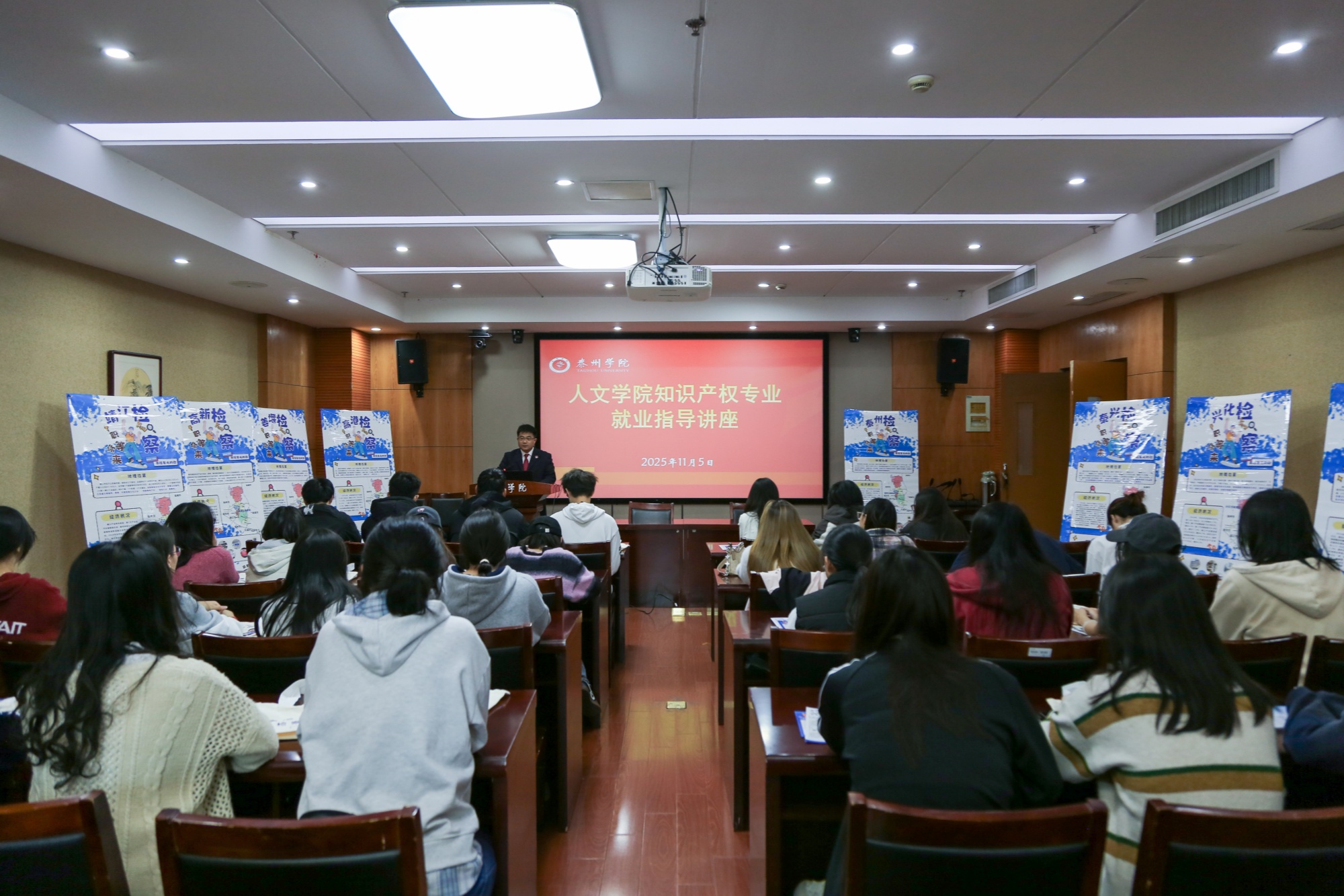 11月5日下午,应人文学院邀请,泰州市高港区检察院、海陵区检察院的检察官们走进bat365,举办法治护航就业讲座,为2026届知识产权专业同学报考检察院公务员提供精准指导。