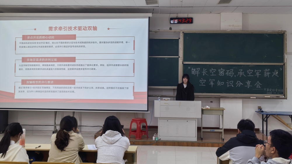 主题分享会在博文楼A2108举行。以空军主题视频拉开序幕,2024级商务英语班谈蕊彤、2025级知识产权班亢亚苗等8名同学依次上台,结合中国歼系战机的迭代升级与大国重器的首次亮相,分享了人民空军从艰难起步到振翅翱翔的奋斗征程。社团指导教师杨雯瑞表示,此次活动不仅重温了人民空军的奋斗历程,更真切感受到空军精神的磅礴力量,对青年学子成长具有启发价值。