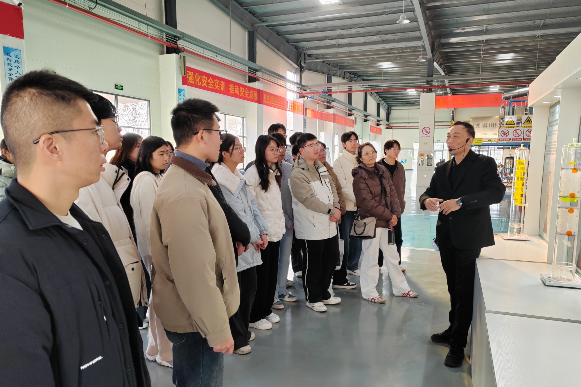 师生一行首站走进泰兴经济开发区化工安全实训基地。在模拟场景中,同学们亲身体验静电防护、化工生产安全应急处置等标准化操作流程,“安全第一、预防为主”的理念通过实操教学深植于心。“只有让教师先感受高标准的安全实训,才能把具象化的安全知识融入日常教学,从源头筑牢学生的职业素养根基。”参与活动的应用化学系教师梁吉雷深有感触地说。