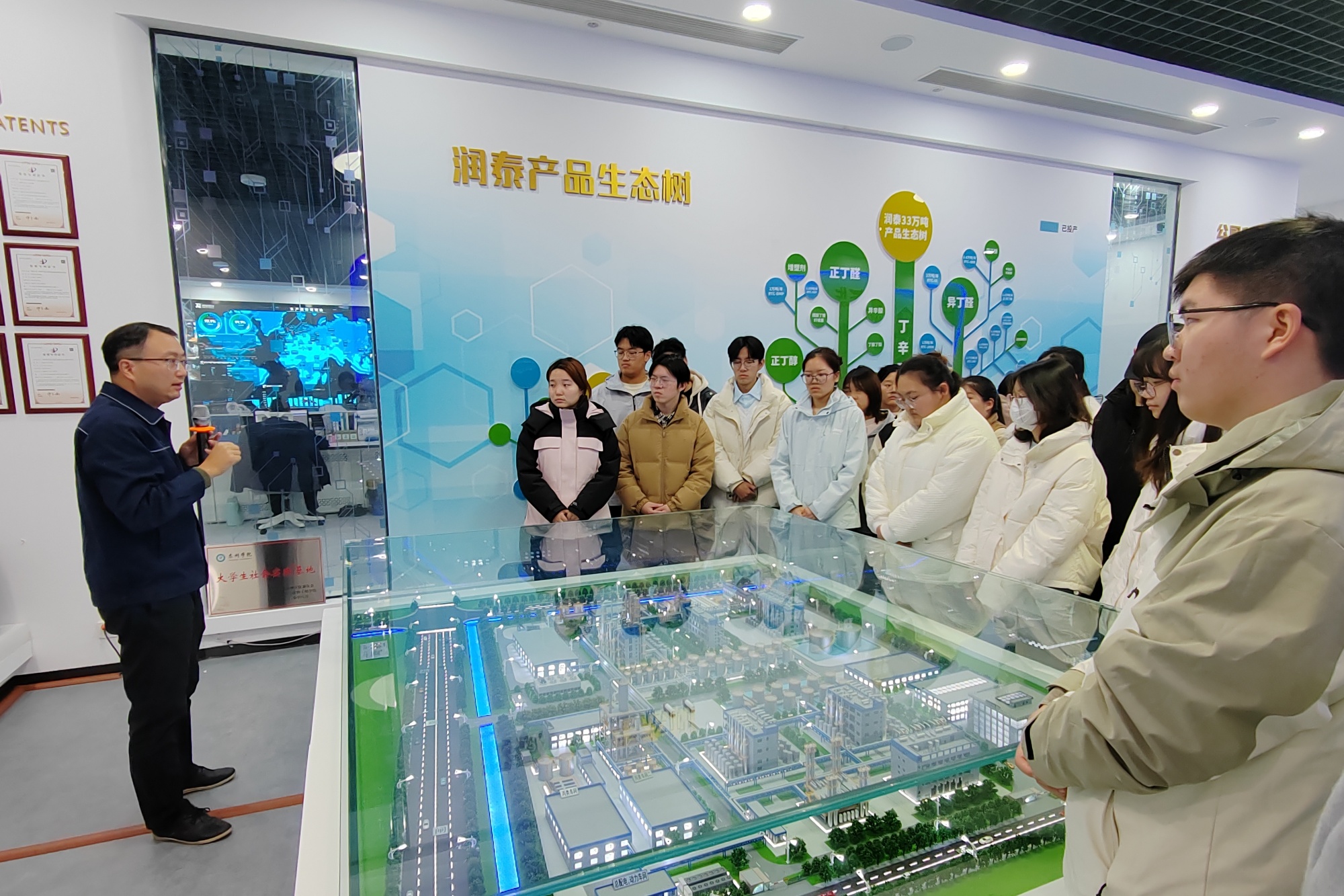 “欢迎‘润泰班’同学回家!”在润泰新材料股份有限公司展厅,公司副总经理卢小松用欢迎语开启了“润泰第一课”。师生们观看企业宣传片,聆听企业成长故事,感悟“润泰新材 润泽未来”的使命责任。走进中央控制室,通过中控系统实时数据,近距离感受现代化工企业的精细化管理体系与“绿色生产 科技赋能”的文化内涵。“以前在课堂上学习的化工生产流程,今天在企业现场找到了具象对应,不仅懂了‘是什么’,更明白了‘为什么’。”“润泰班”学生田泰岳结合专业知识分享了参访收获,他表示此次活动让自己对专业价值有了更清晰的认知,对未来实习就业充满信心。