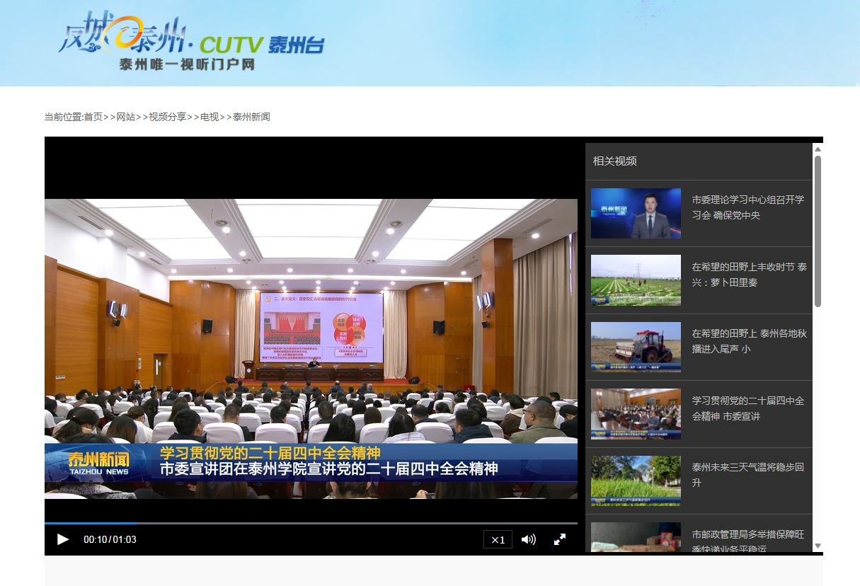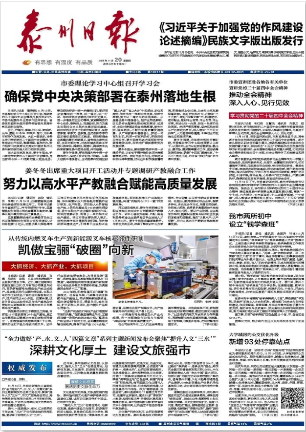 《泰州广播电视台》《泰州日报》2025年11月19日、11月20日报道市委宣讲团赴各地各有关单位宣讲党的二十届四中全会精神