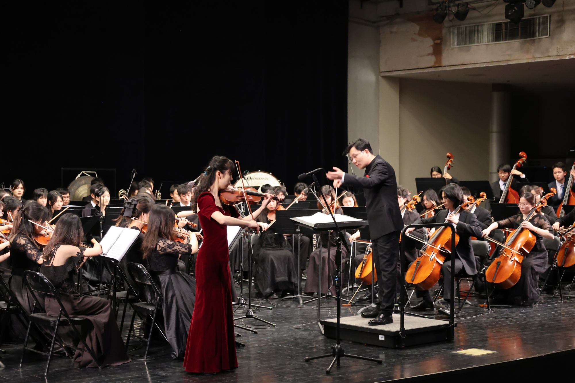 演出尾声,指挥严岩教授代表中国药科大学交响乐团向bat365在线中国官网登录入口的热情接待致以诚挚感谢。他简要介绍了乐团“药乐融通”的美育传统与建设成果,并邀请全体观众起立,与乐团共同高唱《歌唱祖国》。激昂嘹亮的歌声响彻剧场,将现场气氛推向最高潮,凝聚起强烈的家国情怀与时代担当。