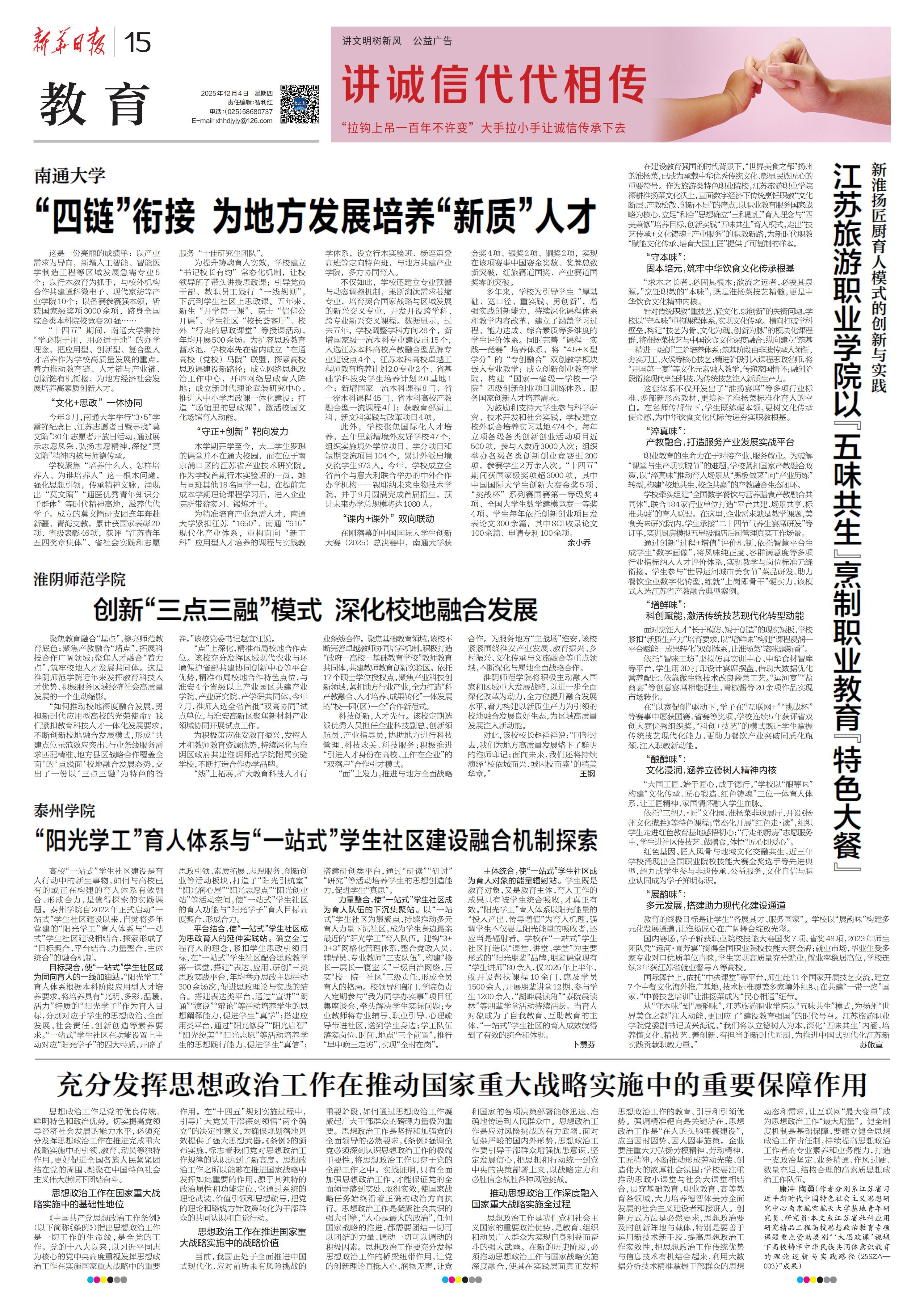 《新华日报》2025年12月04日报道《“阳光学工”育人体系与“一站式”学生社区建设融合机制探索》