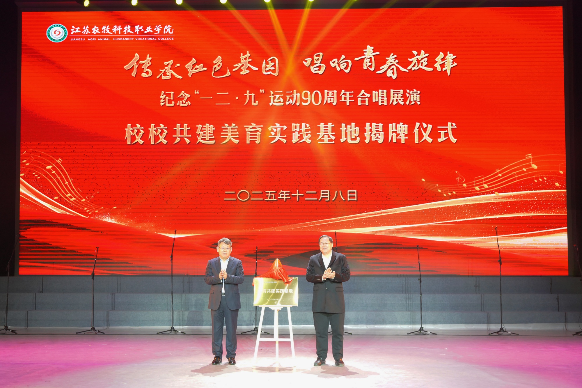 12月8日,bat365与江苏农牧科技职业学院在江苏农牧学院体育馆举行“美育共建实践基地”揭牌仪式。校党委书记徐向明、江苏农牧科技职业学院党委书记朱善元共同为基地揭牌,标志着双方在美育领域的深度合作正式启动,为新时代高校美育协同发展开辟了新路径。
