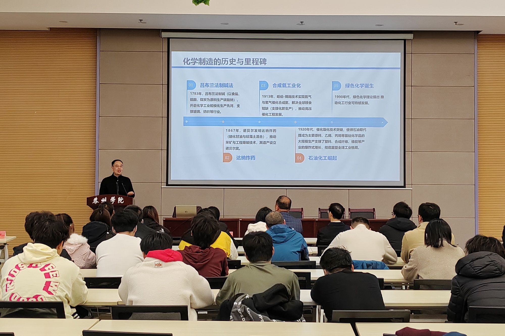 为深入贯彻落实学校“三融三促”发展理念,推动学科建设与产业发展深度融合,12月10日,由中共泰州市委统战部、泰州市科学技术协会主办,化学化工与材料工程学院承办的泰州市第二十期“凤城科技大讲堂”在学校图书馆胡瑗讲堂成功举办。校党委常委、组织部、统战部部长吉泰根,泰州市委统战部副部长项卫东,泰州市科协党组成员、副主席李进等出席活动,化学化工与材料工程学院党总支书记、院长朱诚主持活动。