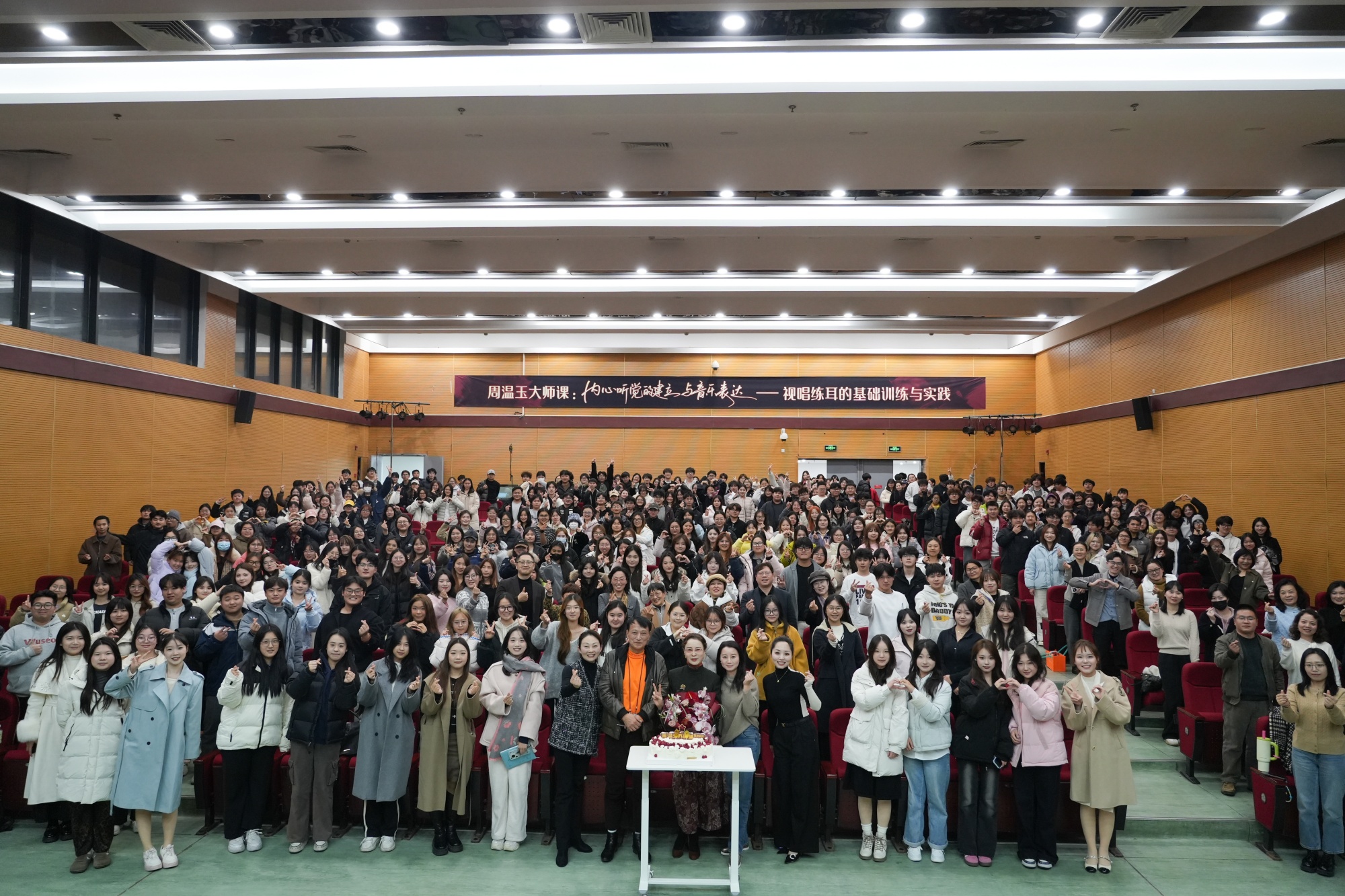 聘任仪式结束后,周温玉以“内心听觉的建立与音乐表达”为主题开讲大师课。她结合中外民歌,进行现场示范与互动练唱,引导学生体会和声色彩、语气线条与情感表达的深层联系。她展示并解析了个人代表作,讲述民族音乐语言在视唱教学与音乐作品表达中的独特价值,展现课程思政融入专业教学的典型实践案例。