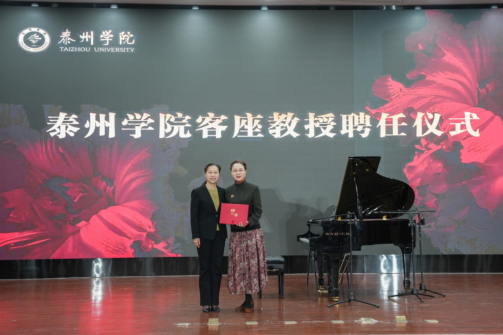 聘任仪式上,赵晓兰为周温玉颁发聘书,对其在音乐教育、创作与学术研究领域的卓越贡献给予高度评价。周温玉教授深耕专业三十余载,出版各类教材十余部,所著《视唱的艺术》中《24调漫游》《和弦连接》等获全国视唱作品教师组创作大奖,被各院校广泛用于视唱音乐会中而成为经典。她主持的课程获评上海市高校重点课程和精品课程,作品《渺》在意大利国际作曲比赛中斩获佳绩,新作《浣溪沙》线上首演更吸引数万人次观看。