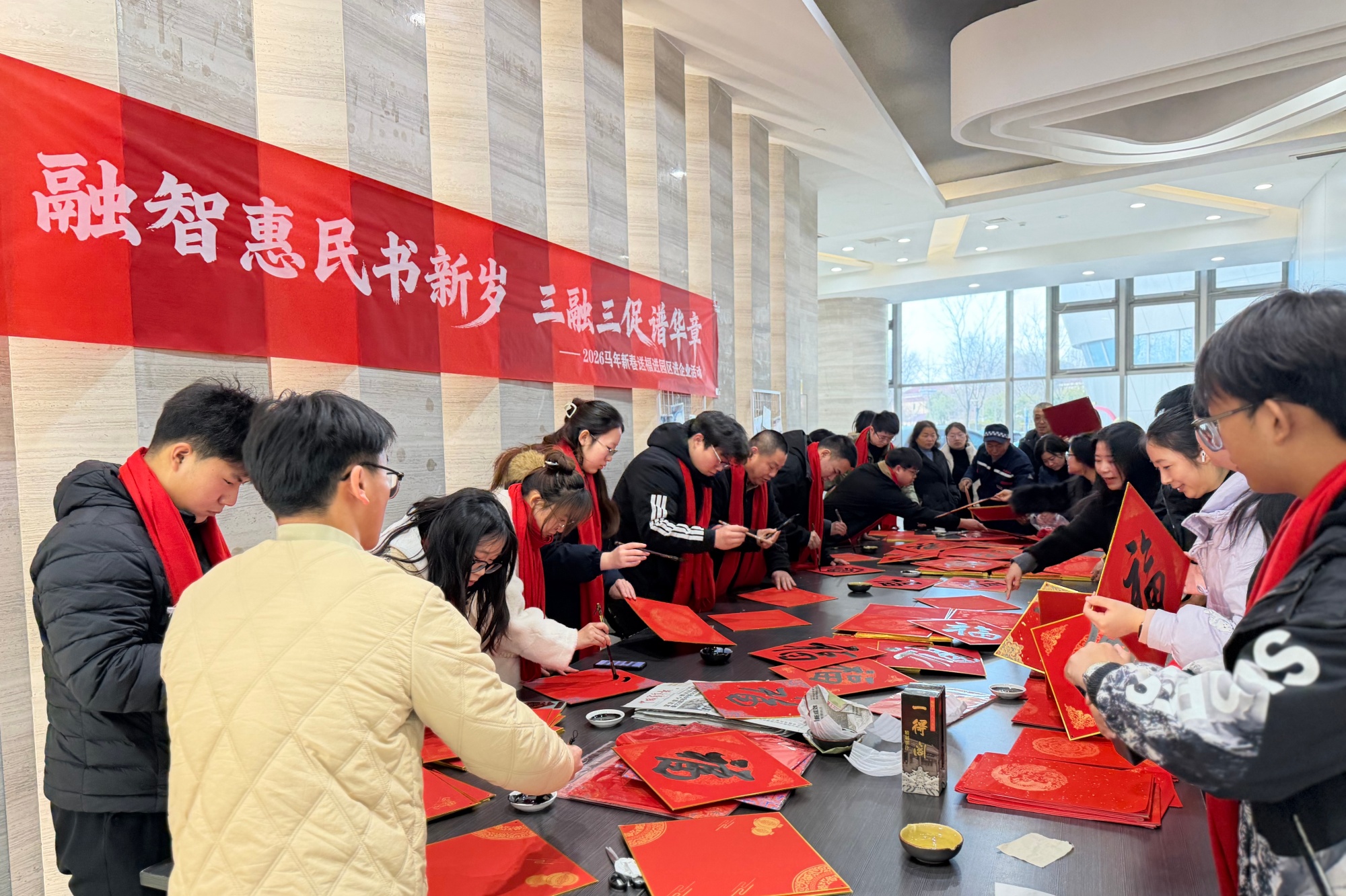 活动现场,书法专业师生挥毫泼墨,一幅幅洒脱规整、寓意吉祥的春联新鲜出炉。创作内容兼具节日氛围与时代内涵,饱含着对家国安宁、时代奋进的真挚祝愿。企业员工、社区居民驻足观赏、有序领取,对师生们精湛的书法技艺赞不绝口。两天时间里,活动累计送出春联及福字1000余幅。