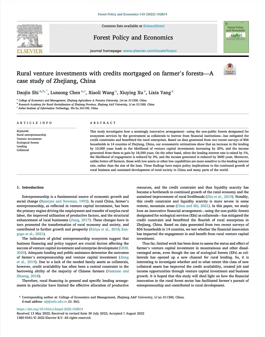 石道金教授研究成果在权威期刊《Forest Policy and Economics》发表 近日,开云院长石道金教授撰写的论文《Rural venture investments with credits mortgaged on farmer’s forests -- A case study of Zhejiang, China》在《Forest Policy and Economics》(SSCI一区,SCI中科院(升级版)二区Top)发表。 该研究基于浙江省森林生态公益林补偿政策的改革实践,对浙江省14个县(市)林业、财政和金融管理部门以及856个山区农户进行了实地访谈和问卷调查,运用Logistic模型、Tobit模型、IV-...