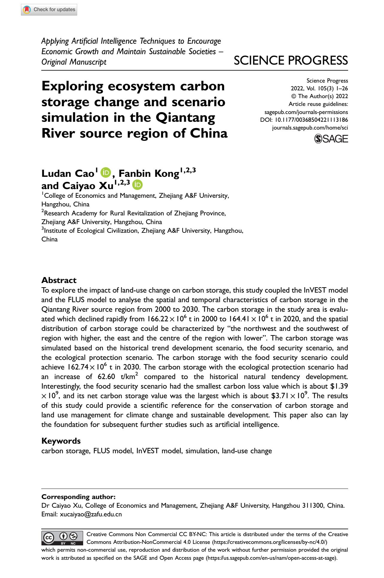 孔凡斌教授团队成果在SCI期刊《Science Progress》在线发表 近日,开云孔凡斌教授团队的研究成果《Exploring ecosystem carbon storage change and scenario simulation in the Qiantang River source region of China》在SCI检索期刊《Science Progress》在线发表。我徐彩瑶博士为论文通讯作者,孔凡斌教授为论文合作作者。 该论文是孔凡斌教授主持的浙江省自然科学基金重点项目“钱江源‘山水工程’生态系统固碳服务供需权衡机制及碳中和规划管理优化”(Z22D010686)等项目的阶段...