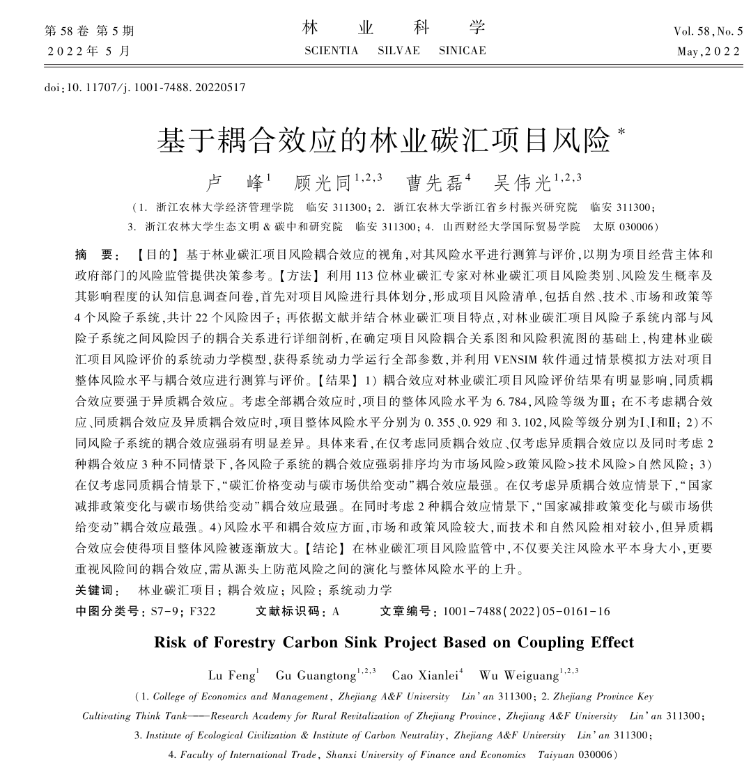 吴伟光教授团队研究成果在《林业科学》发表 近日,开云吴伟光教授和顾光同副教授与其共同指导的农林经济管理硕士研究生卢峰等合作的研究成果《基于耦合效应的林业碳汇项目风险》在《林业科学》2022年第5期发表,吴伟光教授为该文通讯作者。《林业科学》是浙大一级期刊,也是EI检索源刊。 森林碳汇是应对气候变化潜力较大且较为经济有效的手段之一,我国已将森林增汇作为应对气候变化的国家战略,并于2020年正式提出了“碳达峰碳中和”宏伟战略目标。在此背景下,林业...