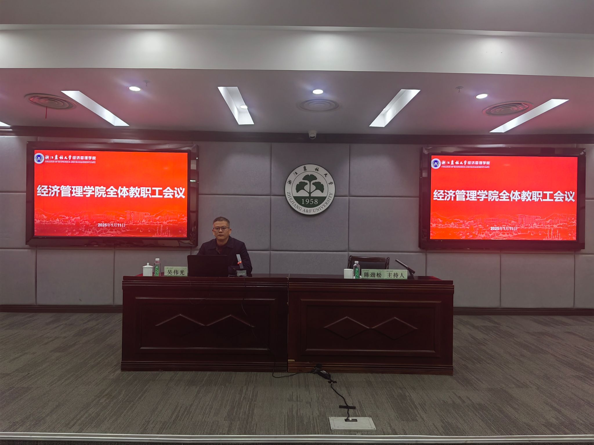 学院召开全体教职工大会 2月21日下午,学院在衣锦报告厅召开新学期全体教职工大会。学院领导班子成员及全体教职工参加会议。大会由党委书记陈劲松主持。院长吴伟光分析了当前学院发展态势,强调大家要有充分的自信和忧患意识,并提出三点要求,一是眼光朝外找准自己的方位,二是积极谋划主动作为,三是守牢底线突出重点。他指出学院量质齐升的教师队伍是学院高水平发展的最大底气,要抓好人才引进窗口期,用好柔性引人政策,扎实推进学院各项工作,为学...