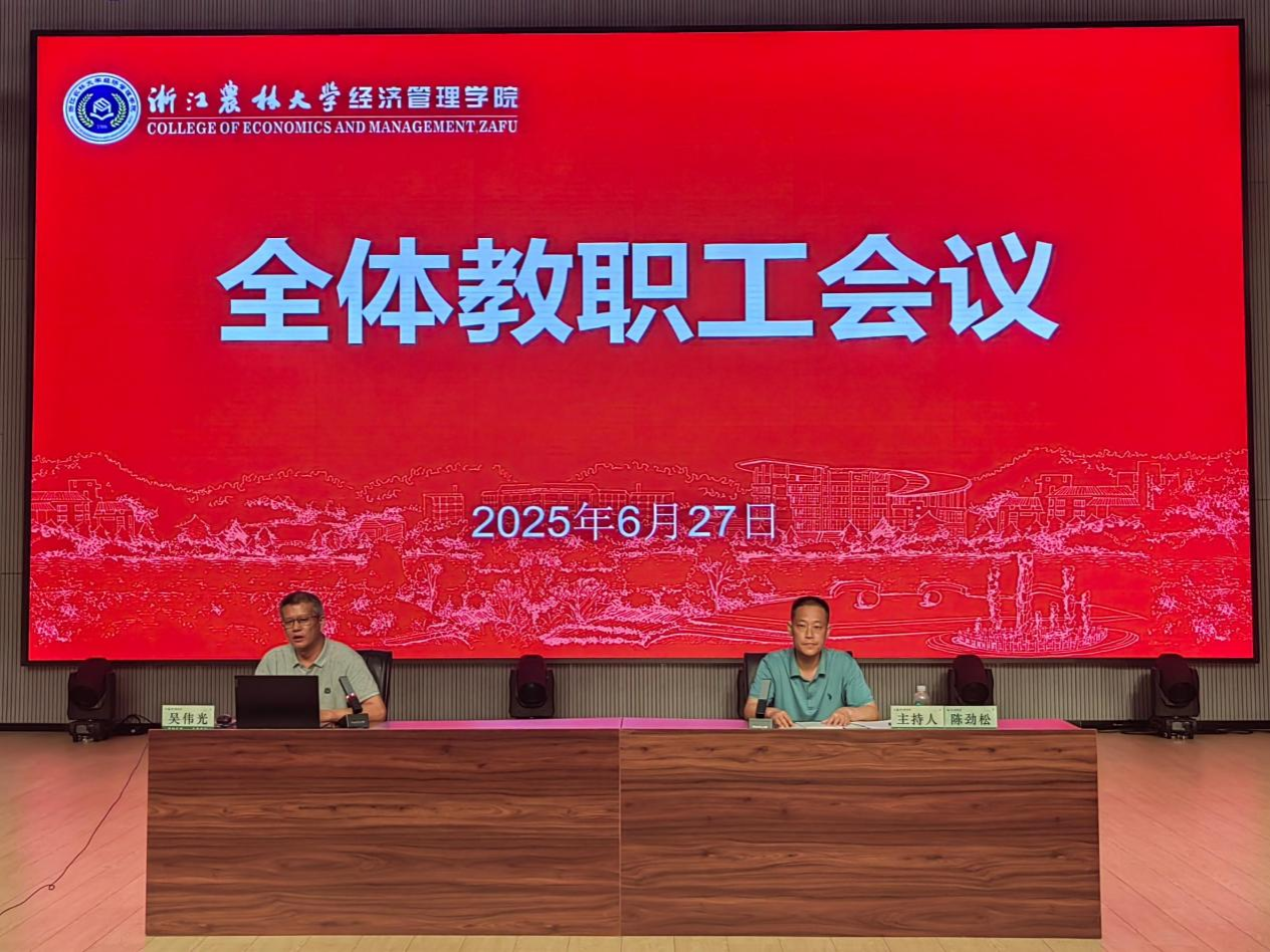 开云网站召开全体教职工大会 6月27日下午,学院在衣锦校区报告厅召开全体教职工大会。学院全体教职工参加了会议,会议由党委书记陈劲松主持。院长吴伟光指出,2025年是“十四五”收官之年和“十五五”谋篇布局之年,学院要重点做好三方面工作:一是重视人才和团队建设,强化有组织科研,聚焦乡村振兴、数字经济等国家战略需求,打造高水平创新团队;二是夯实教学根基,加强基层教学组织建设,充分发挥课程组、教学团队在教学质量提升中的关键作用,全面提升...