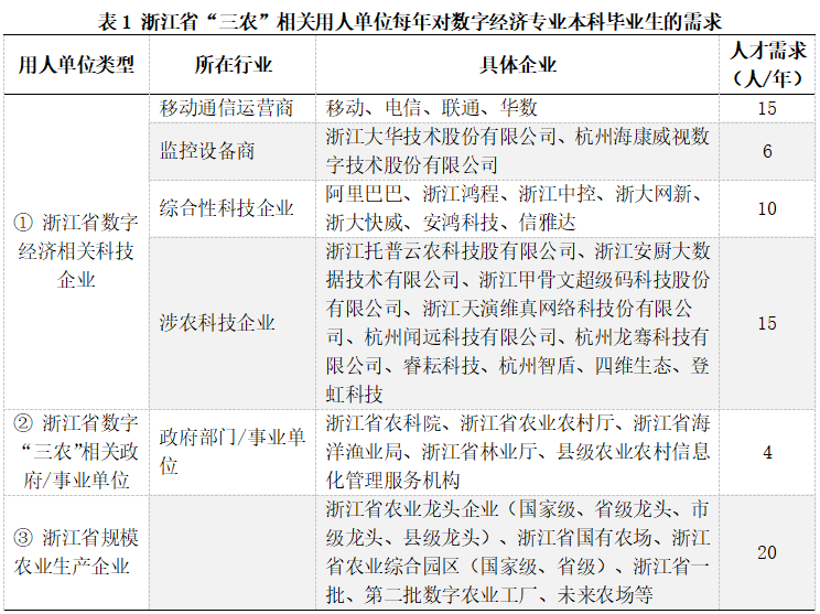 浙江省正在探索以数字经济赋能共同富裕之路,旨在实现“做强做优做大数字经济”的过程中推动实现“共同富裕取得实质性进展”的目标。结合开云办学特色,通过调研与访谈,汇总出部分省内相关用人单位每年对数字经济专业本科毕业生的需求与相关岗位如表1和表2: