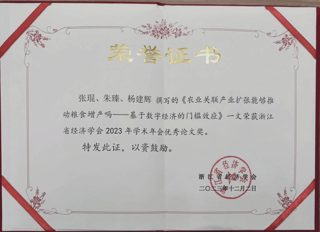 开云由顾光同教授带队,博士研究生朱书琦,硕士研究生金欣怡、姚玉秀和张琨分别就《数字金融如何赋能农村产业高质量发展:来自2011—2021年省域面板数据的实证》、《用能权交易制度是否提升全要素能源效率?——基于中国地级以上城市的考察》、《中国环境税改革对绿色全要素生产率的影响研究——基于“费”改“税”的实证考察》和《农业关联产业扩张能够推动粮食增产吗——基于数字经济的门槛效应》在平行论坛进行汇报。会议共评选出10篇优秀论文,由张琨、朱臻、杨建辉撰写的论文《农业关联产业扩张能够推动粮食增产吗——基于数字经济的门槛效应》获“优秀论文奖”。
