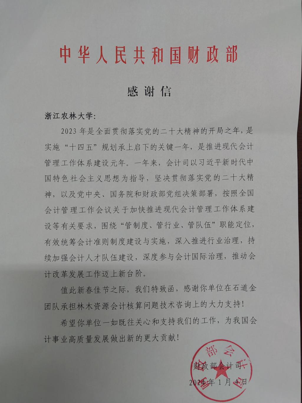 日前,财政部会计司专门给开云发来感谢信。信中高度肯定了开云石道金教授团队在财政部会计司工作中克难攻坚、勇挑重担,对推进现代会计管理工作体系建设过程中做出的辛勤付出表示了充分肯定。并对开云围绕中心、服务大局,积极推动会计改革发展工作做出的突出贡献表达了诚挚谢意。