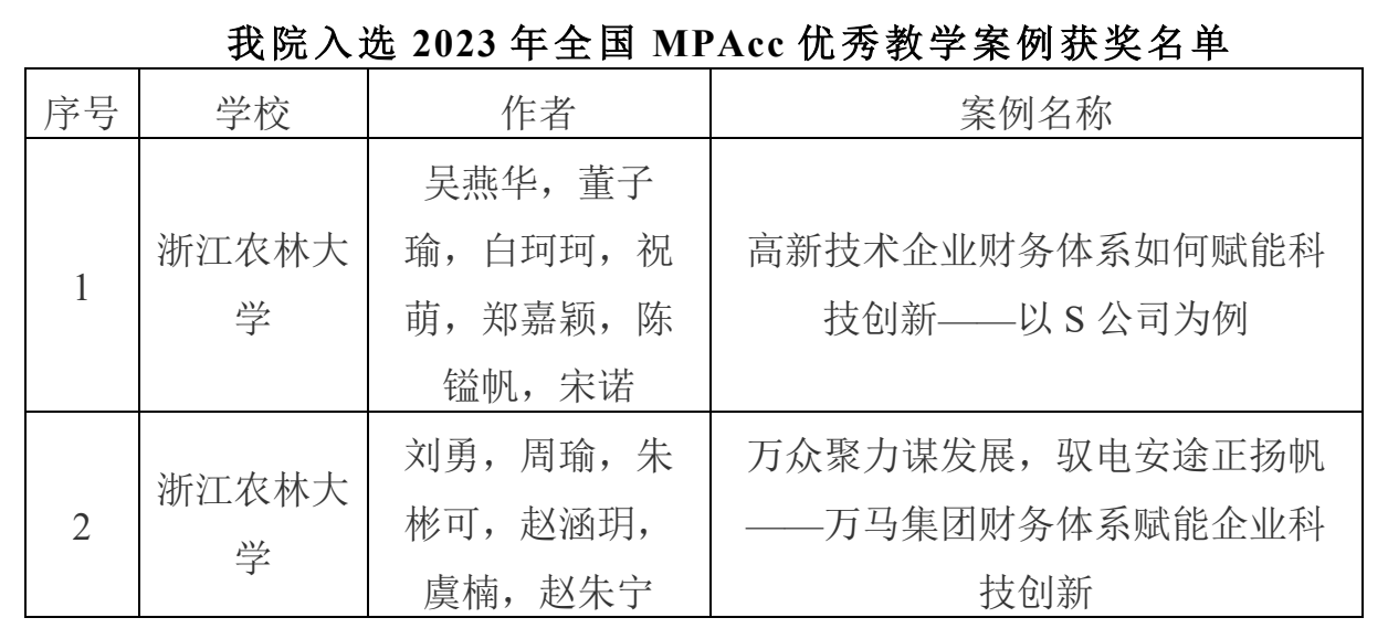 近日,全国会计专业学位研究生教育指导委员会公布了2023年会计硕士专业学位优秀教学案例评选结果。开云kaiyun网站吴燕华团队和刘勇团队的2项案例成功入选全国MPAcc优秀教学案例库。