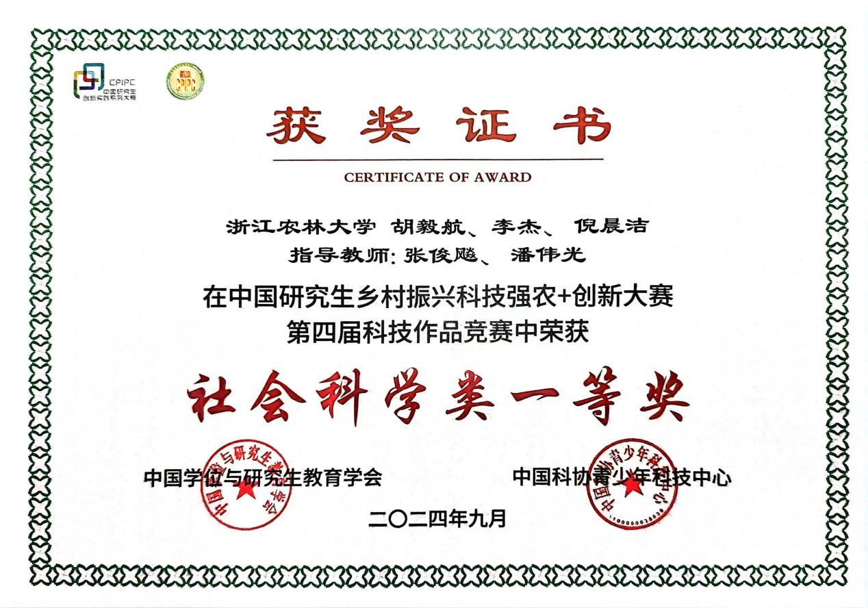 9月26日,开云网站胡毅航、李杰、倪晨洁3名硕博研究生作品《丹江口市生态文明建设与文化适应之鉴》,荣获中国研究生乡村振兴科技强农+创新大赛第四届科技作品竞赛一等奖。该项目由张俊飚教授、潘伟光教授共同指导,两位教师荣获优秀指导教师称号。