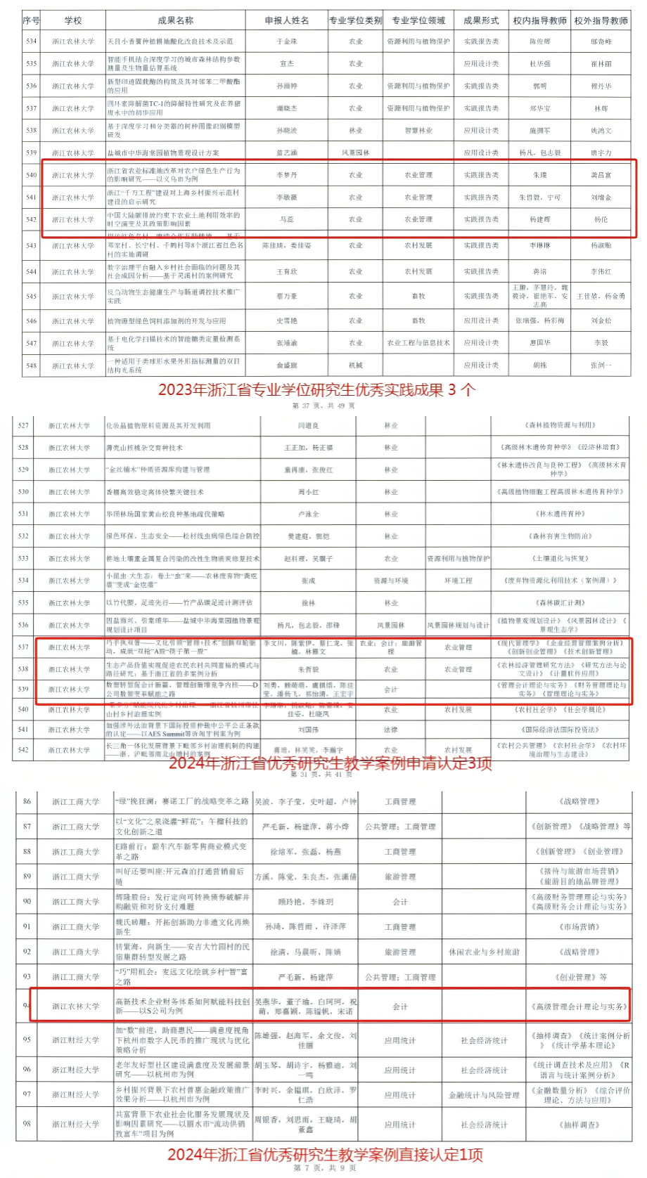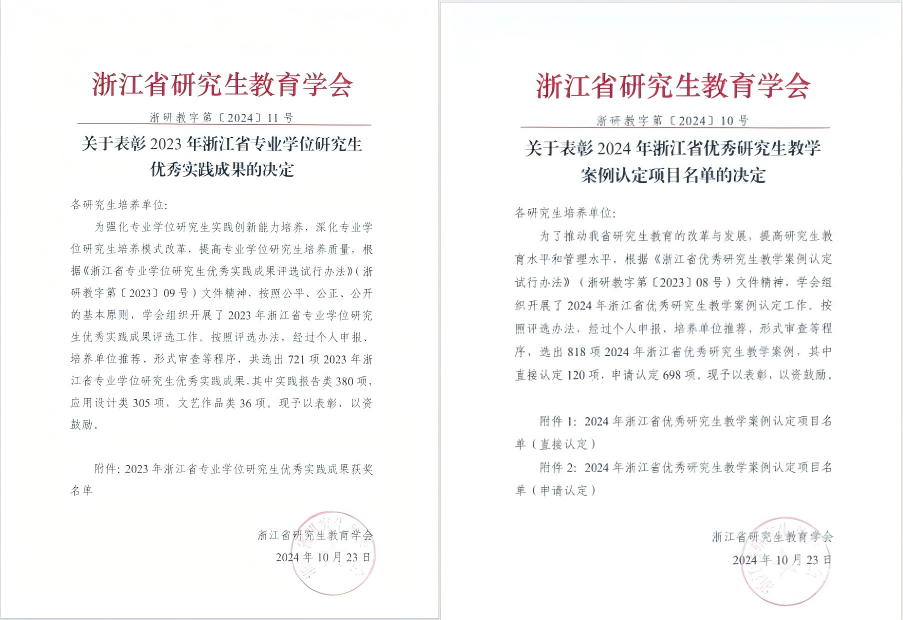 近日,浙江省研究生教育学会正式公布了《关于表彰2024年浙江省优秀研究生教学案例认定项目名单的决定》(浙研教字第[2024]10号)和《关于表彰2023年浙江省专业学位研究生优秀实践成果的决定》(浙研教字第[2024]11号)。