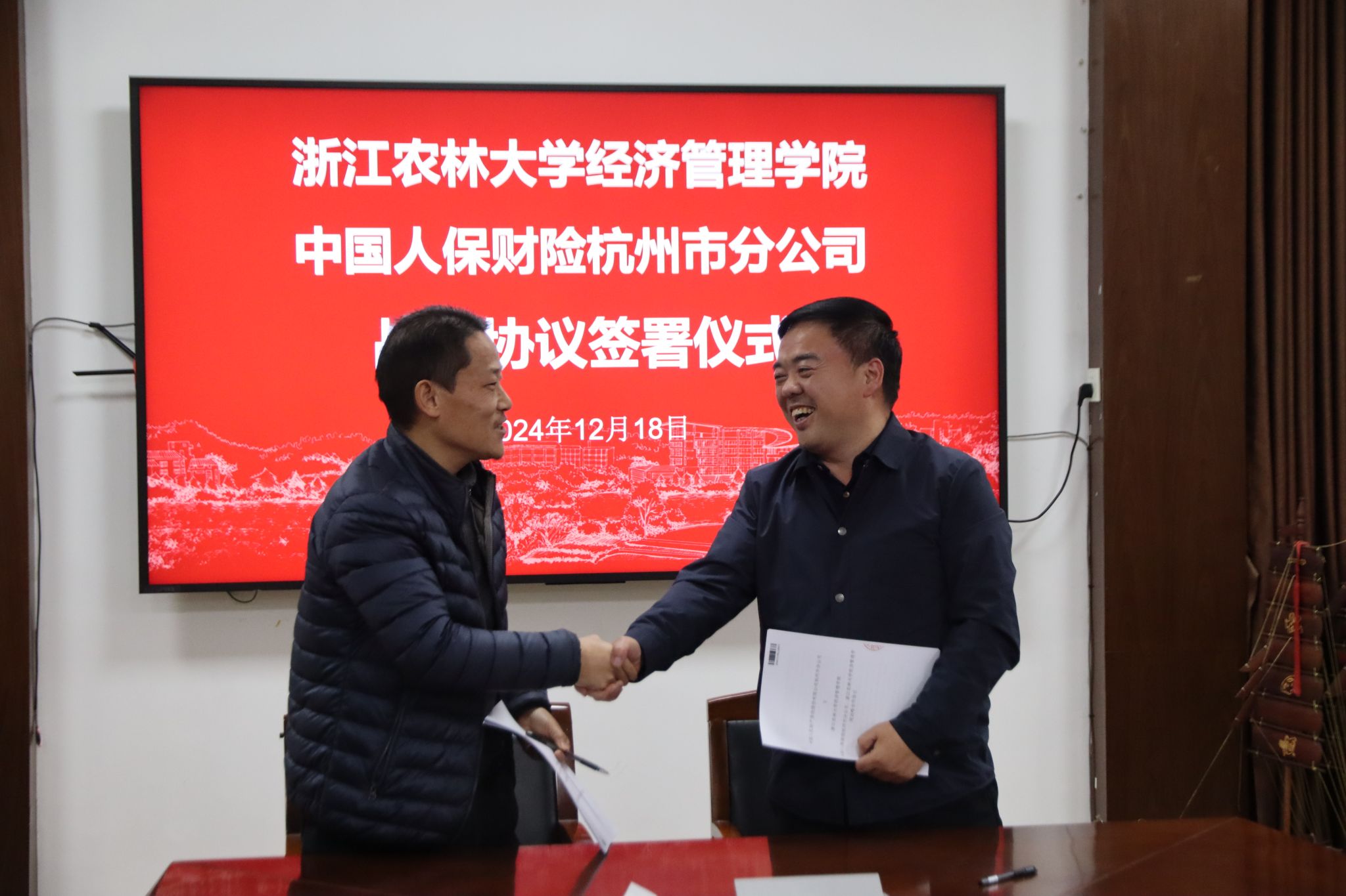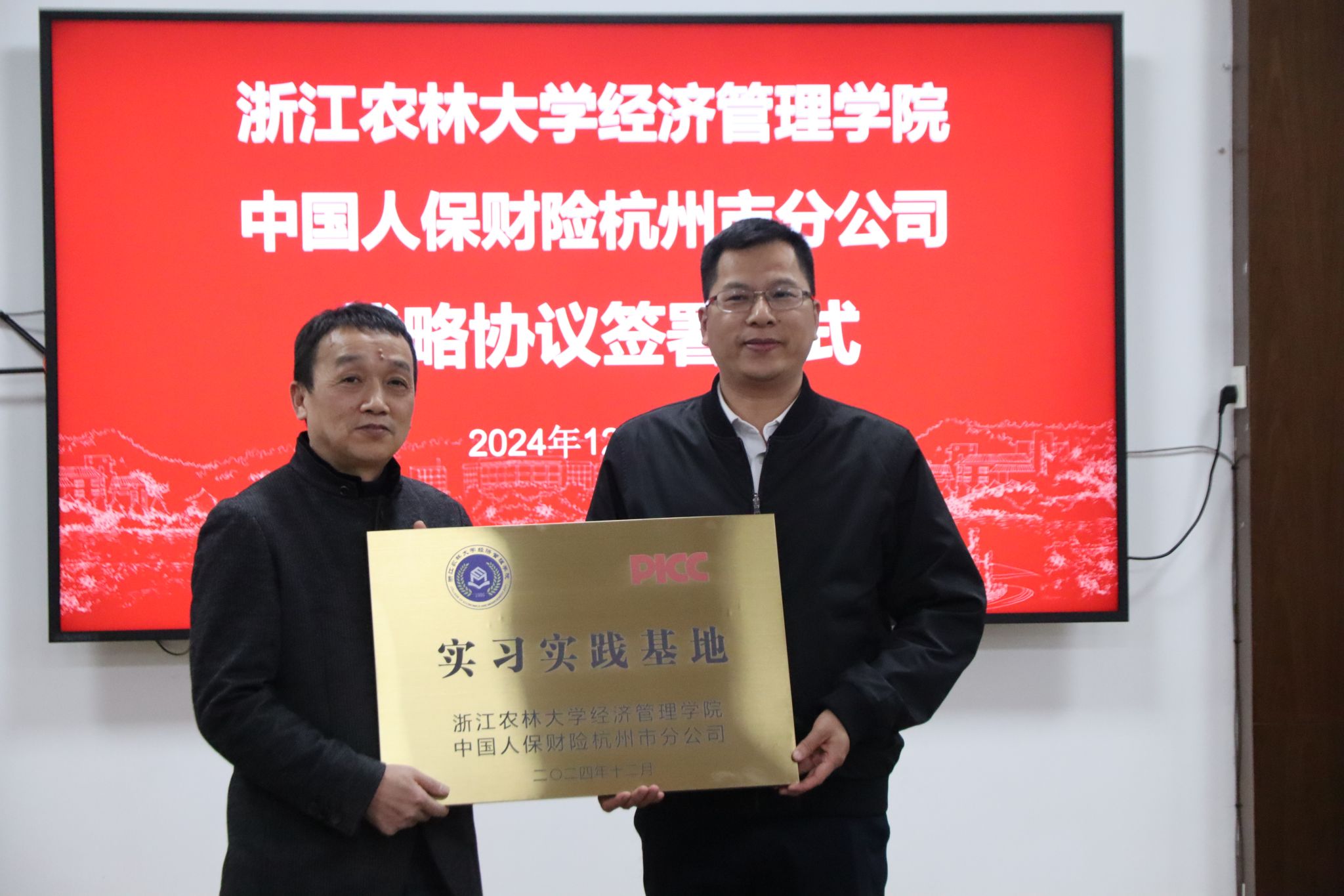 12月18日下午,开云网站与中国人保财险杭州市分公司战略合作协议签约暨实习实践基地授牌仪式在西大楼208会议室举行。中国人保财险杭州市分公司副总经理詹春林、开云网站党委书记陈劲松,双方团委、学科专业、行政人事及学生办等相关人员,参加了仪式。