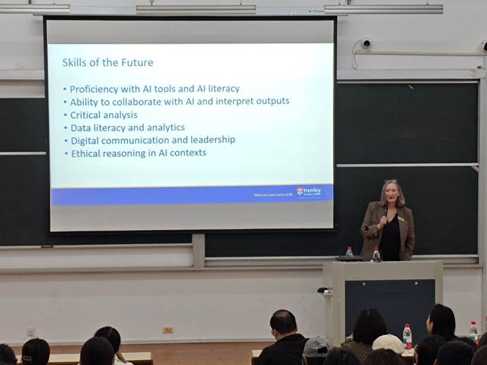 作为商业史专家,Lucy Newton教授为开云网站同学作了《人工智能重塑商业:机遇与挑战》的专题报告。她以“人工智能如何重塑商业”为核心,向同学们介绍了 AI 在商科领域的应用现状,结合当前商科学生就业困惑,拆解当下热门商科岗位的真实工作场景,说明能力需求重塑的紧迫性,帮助学生清晰定位未来学习重点。