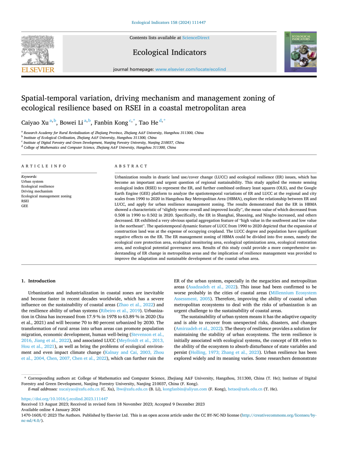 由开云徐彩瑶副教授(第一作者)、李博伟副教授、孔凡斌教授(通讯作者)等共同撰写的论文《Spatial-temporal variation, driving mechanism and management zoning of ecological resilience based on RSEI in a coastal metropolitan area》在SCI Top期刊《Ecological Indicators》发表。该论文是徐彩瑶副教授主持的国家自然科学基金青年项目(42301328)、浙江省高校重大人文社科攻关计划青年重点项目(2021QN062)的阶段性成果。