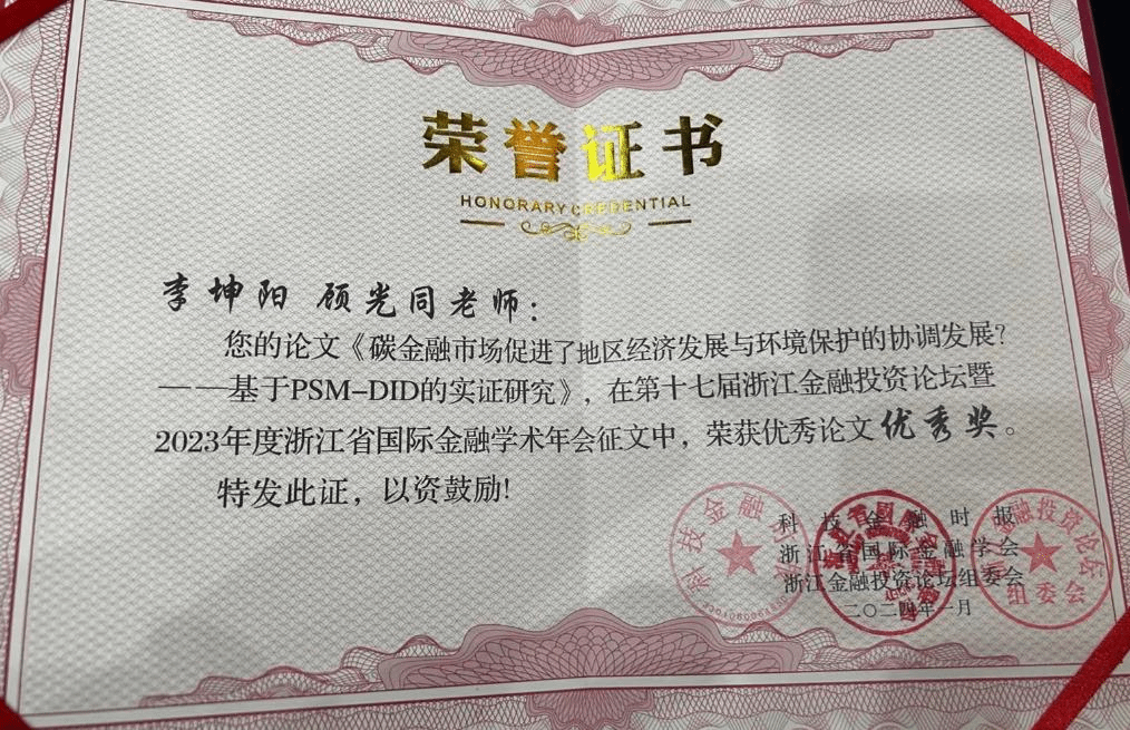 大会还举行了2023年度学术成果优秀论文颁奖仪式。本次征文收到来自浙江大学、浙江工商大学、kaiyun官方登录入口等多所省内外高校专家学者的论文投稿,顾光同教授指导的农业管理研究生李坤阳撰写的论文《碳金融市场促进了地区经济发展与环境保护的协调发展?——基于PSM-DID的实证研究》荣获优秀论文优秀奖。