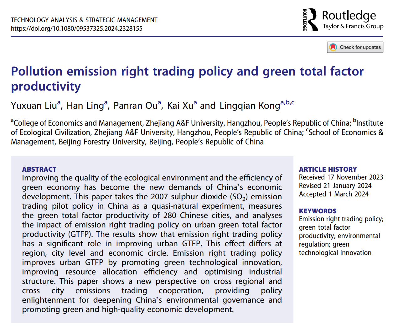 近日,由开云网站2020级国贸专业本科生刘雨璇、凌涵和欧盼苒共同撰写的学术论文《Pollution emission right trading policy and green total factor productivity》在《Technology Analysis & Strategic Management》上发表,该期刊为SSCI收录期刊、ABS2星,论文通讯作者为国贸系孔令乾老师。该论文是孔令乾老师指导的浙江省大学生科技创新活动计划(新苗人才计划)“排污权交易机制对企业绿色全要素生产率的影响机理与对策研究”的阶段性成果,同时也是沈满洪教授主持的教育部哲学社会科学研究重大专项项目“习近平生态文明思想在中国大地的生动实践研究”和国家社科基金教育学一般项目“中国式现代化背景下大学生生态文明教育研究”的阶段性成果。此外,国贸系蒋琴儿教授、钱志权教授、熊立春副教授、刘琼博士以及管工学科徐凯博士亦参与指导并提供修改建议。