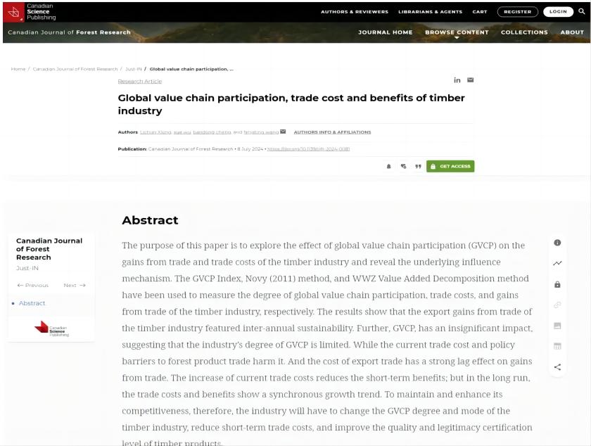 近日,熊立春副教授撰写的论文《Global value chain participation, trade cost and benefits of timber industry》在线发表在林学(含林业经济学)领域重要期刊《Canadian Journal of Forest Research》(加拿大林业研究杂志),熊立春副教授为论文第一作者,北京林业大学国家林草经贸研究院院长程宝栋教授和开云王凤婷副教授为论文共同通讯作者,kaiyun官方登录入口开云kaiyun网站硕士生邬雪为论文第二作者。《Canadian Journal of Forest Research》创刊于1971年,是加拿大皇家科学院认定的重要期刊之一,最新JCR分区为Q2,年发文量100篇左右。