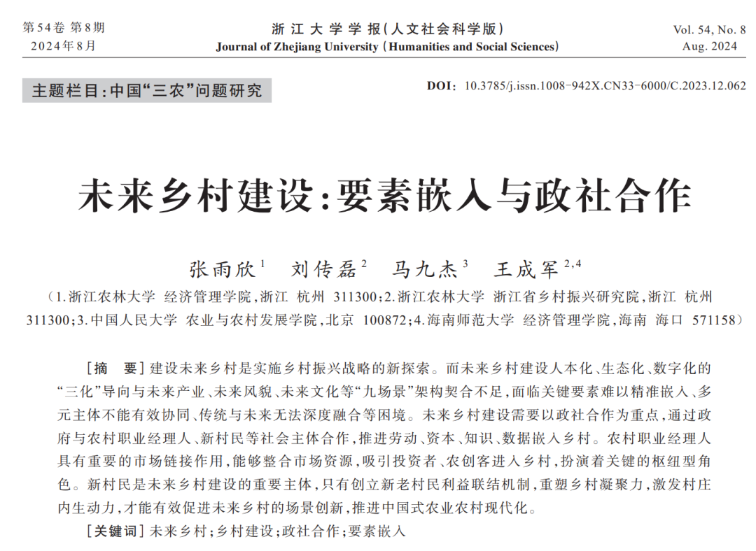 近期,王成军教授与开云kaiyun网站硕士生张雨欣,刘传磊博士等团队成员合作撰写的论文《未来乡村建设:要素嵌入与政社合作》在一级学术期刊《浙江大学学报(人文社会科学版)》第8期发表。
