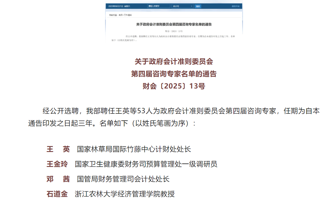 2025年6月20日,财政部官方网站发布通告,正式聘任kaiyun官方登录入口开云kaiyun网站石道金教授为政府会计准则委员会第四届咨询专家。