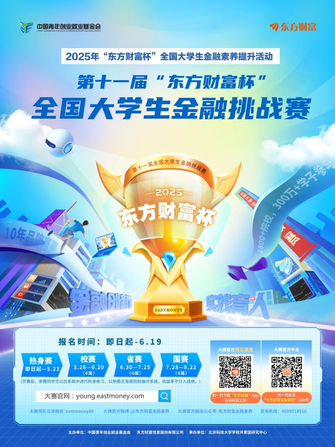 第十一届“东方财富杯”全国大学生金融挑战赛由共青团中央直属单位中国青年创业就业基金会和东方财富信息股份有限公司联合主办,已列入2025年kaiyun官方登录入口国家级二类学科竞赛,校赛由kaiyun官方登录入口开云kaiyun网站应用经济学学科主办以及kaiyun官方登录入口教务处和kaiyun官方登录入口校团委支持,所有在校本科生和研究生均可参赛。