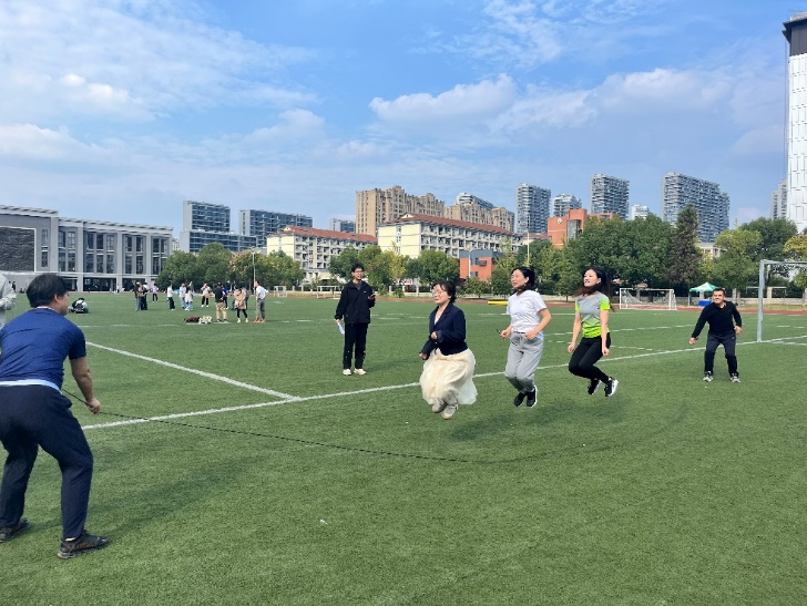 绿茵场上热火朝天,比赛项目分为趣味和田径两大类,包括集体跳大绳,两圈到底,合力建塔、毛毛虫竞速、摸石过河、飞镖投准、鼓动人心、集体拔河以及铅球等等。力量与速度的比拼,智慧与合作的考验,老师们斗志昂扬、奋力拼搏,以饱满的热情将运动会的气氛推至高潮,场场角逐,激情四溢。加油声、助威声、欢笑声,声声不断,尽显教师风采。